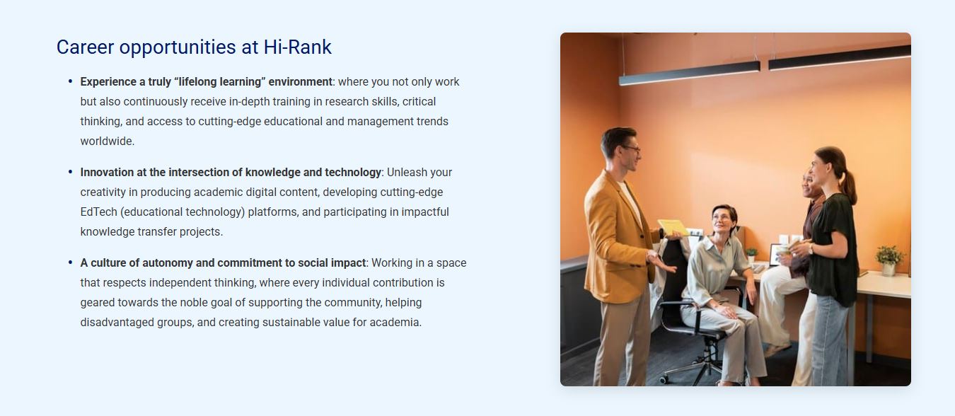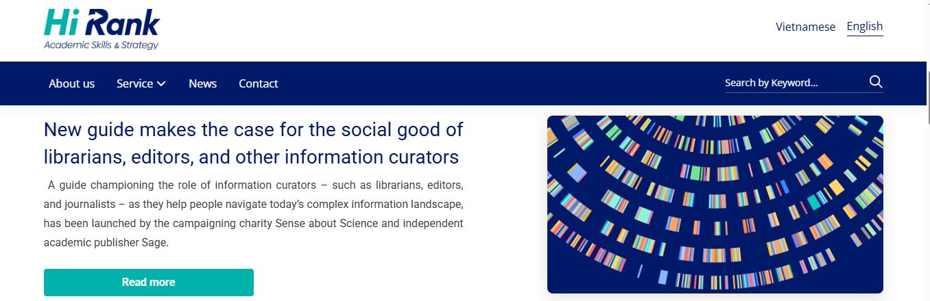 Khác với sự hào nhoáng của các trang thương mại, thiết kế của Hi-Rank Academic tập trung vào sự tinh tế, sang trọng và có chiều sâu. Đội ngũ thiết kế của Ninja Dona đã khéo léo sử dụng bố cục hiện đại để tôn vinh nội dung chữ viết, tạo ra một không gian trực tuyến thoáng đạt nhưng đầy cảm hứng nghiên cứu. Từng tông màu, phông chữ và khoảng trắng trên website đều được tính toán có chủ ý, mang lại trải nghiệm thị giác chuyên nghiệp. Sự kết hợp giữa tính học thuật nghiêm túc và tư duy thẩm mỹ hiện đại của Ninja Dona đã tạo nên một sản phẩm vừa mang hơi thở công nghệ, vừa giữ trọn vẹn sự thanh lịch, nhân văn của giáo dục.
